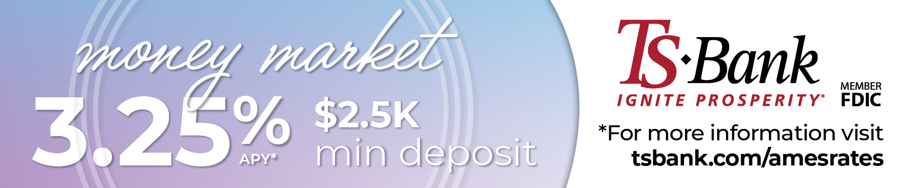 *APY = Annual Percentage Yield. APY is accurate as of 04/01/2026. $2,500 minimum deposit to open. $2,500 minimum average daily balance to earn APY. $2,500 minimum average daily balance to avoid the $12.50 monthly service charge. Fees may reduce earnings on the account. Rates may change after the account is opened. Available on consumer accounts only. Please see a Universal Banker for further information about the applicable fees and terms. Offer available at our Ames location only. TS Bank, Member FDIC.